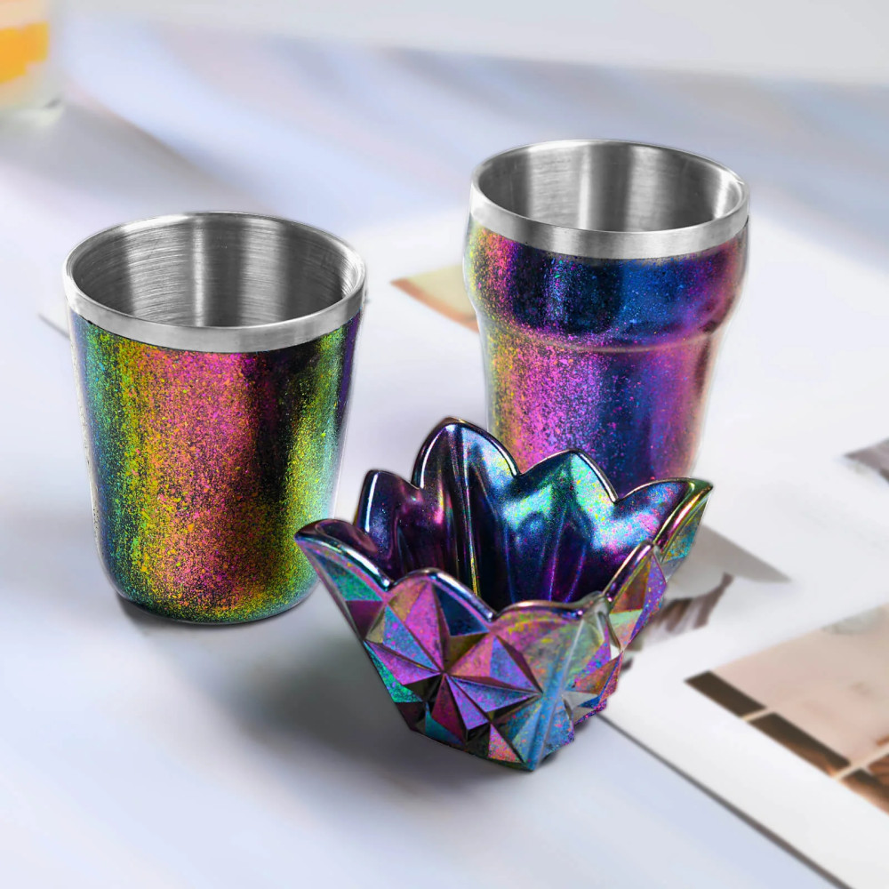 - Hatás: A színek változnak a fény és a néző szöge szerint, feltűnő és vizuálisan erőteljes